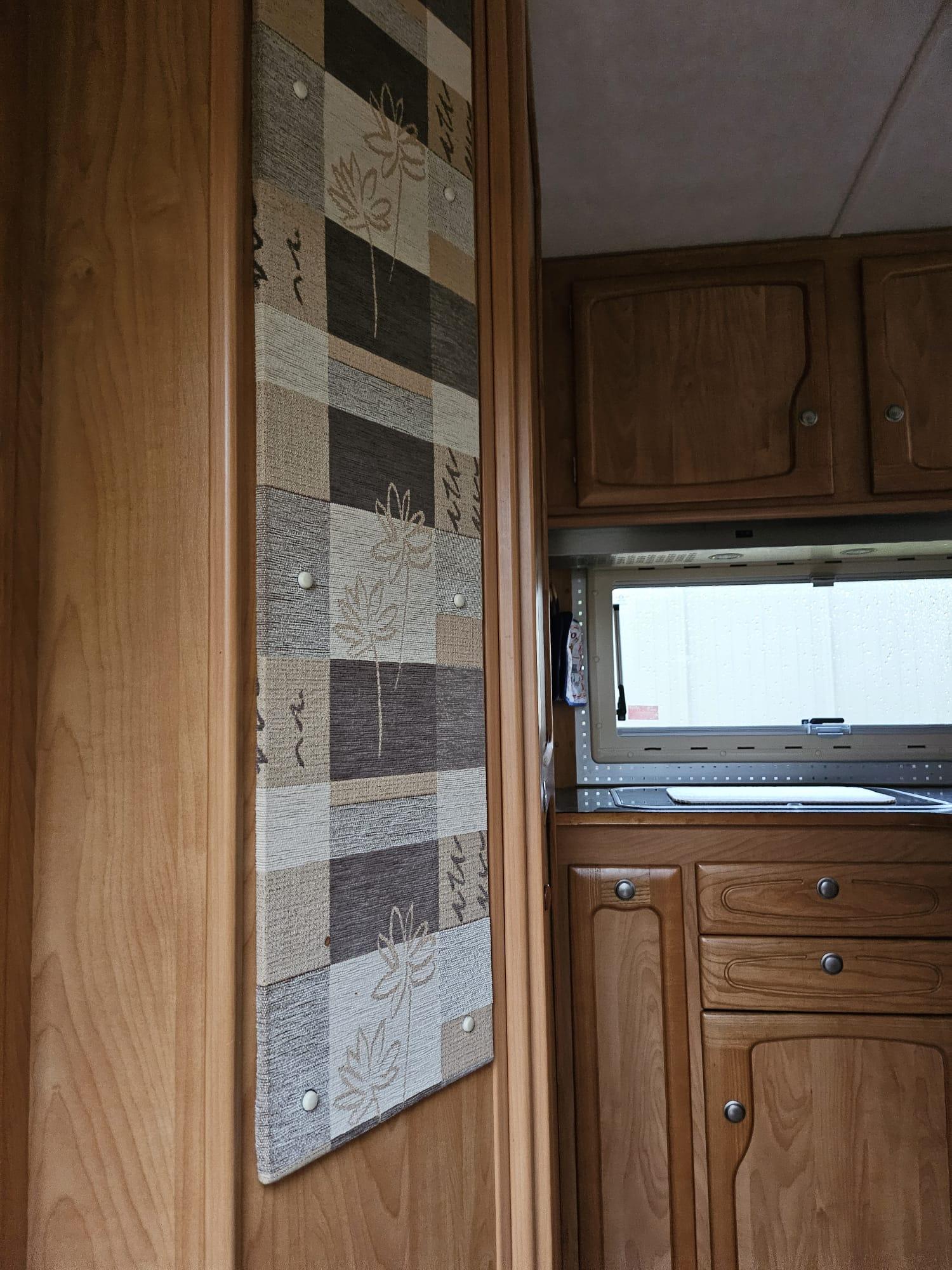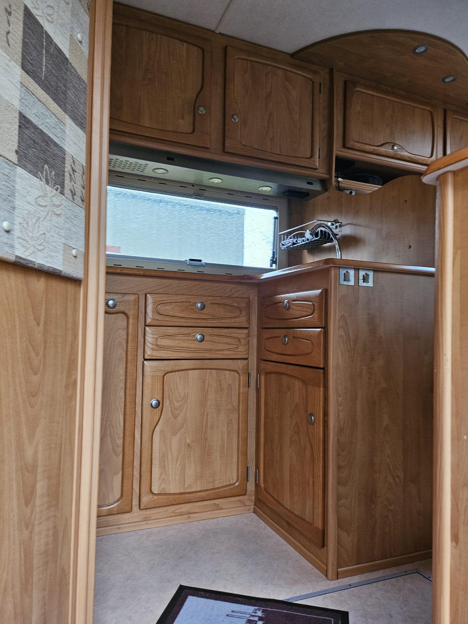 Als u de camper instapt ziet u recht tegenover u de keuken in een hoek - opstelling die ruim van opzet is en prettig is om alles binnen klaar te maken en buiten te nuttigen.