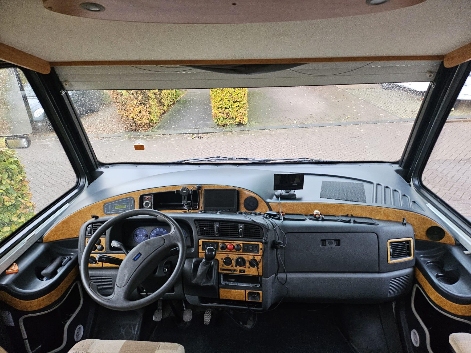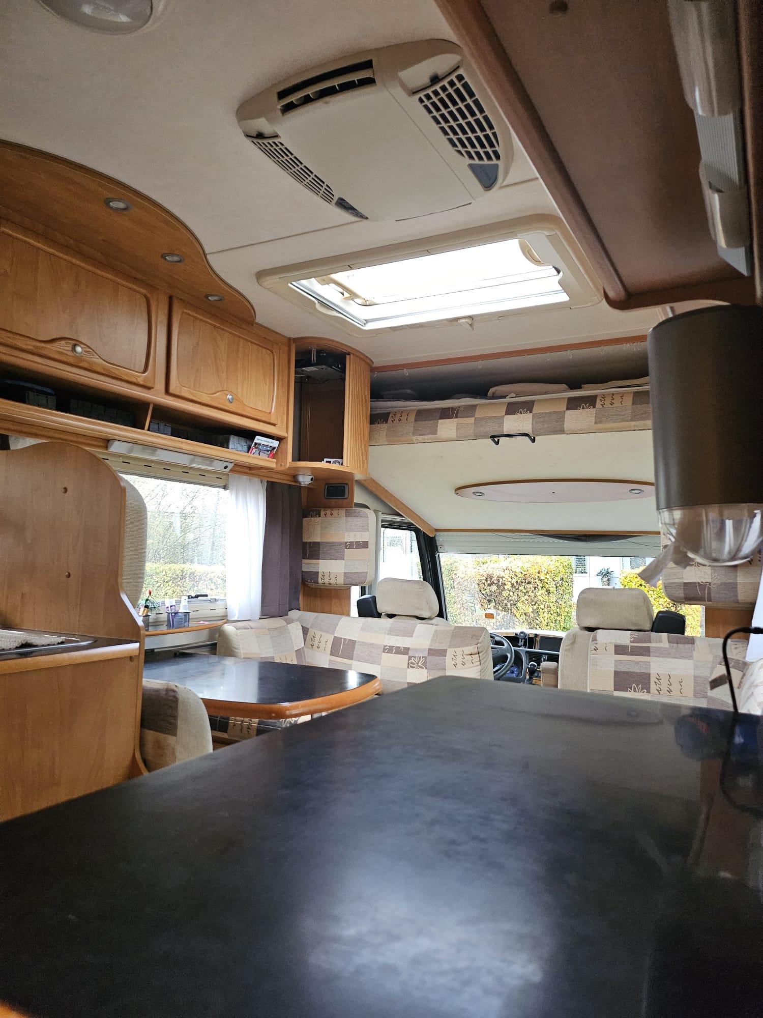 Een camper met grote leefruimte, dubbele bodem, 2 X airco , LPG onderbouw en nieuw geleverd in Nederland in 2002 .
